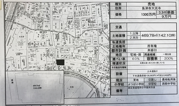魚津市 大光寺 物件の詳細 価格 1300万円 間取り - 販売戸数 - 総戸数 - 土地面積 469.78㎡ 建物面積 -㎡ 私道負担・道路 - 完成時期および築年数 - 住所 富山県魚津市 交通 - 駐車場 - 取引形態 - お問い合わせする 物件の写真 物件の地図 この物件についての無料お問い合わせ・ご相談 ご相談やお問い合わせは電話でも承ります。 受付9:00 - 18:00(水曜日定休日)0765-24-5661 お名前の入力必須 電話番号の入力必須 メールアドレスの入力必須 確認用メールアドレスの入力必須 性別必須 選択してください男性女性 年齢必須 確認したい事項の記入任意