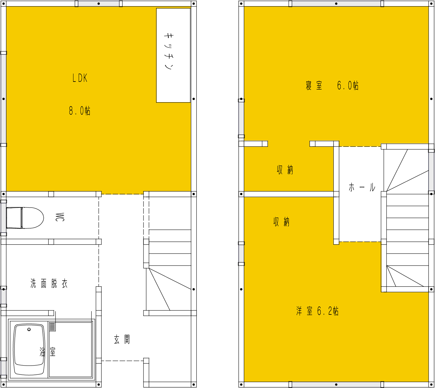 基本スタイルの2LDK(2〜3名向け)コンパクトで狭小地にも配置できます。土地効率に優れ、利用者の人気も高い商品です。
